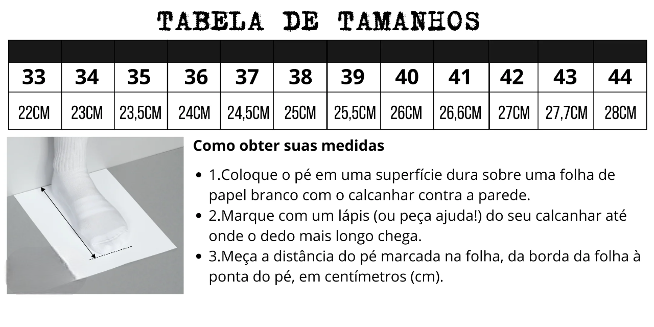 O tamanho deve ser consultado na tabela de medidas acima. O cliente deve medir o seu pé e escolher o seu tamanho de acordo com a medida. Mas geralmente o número que você calça irá servir perfeitamente.